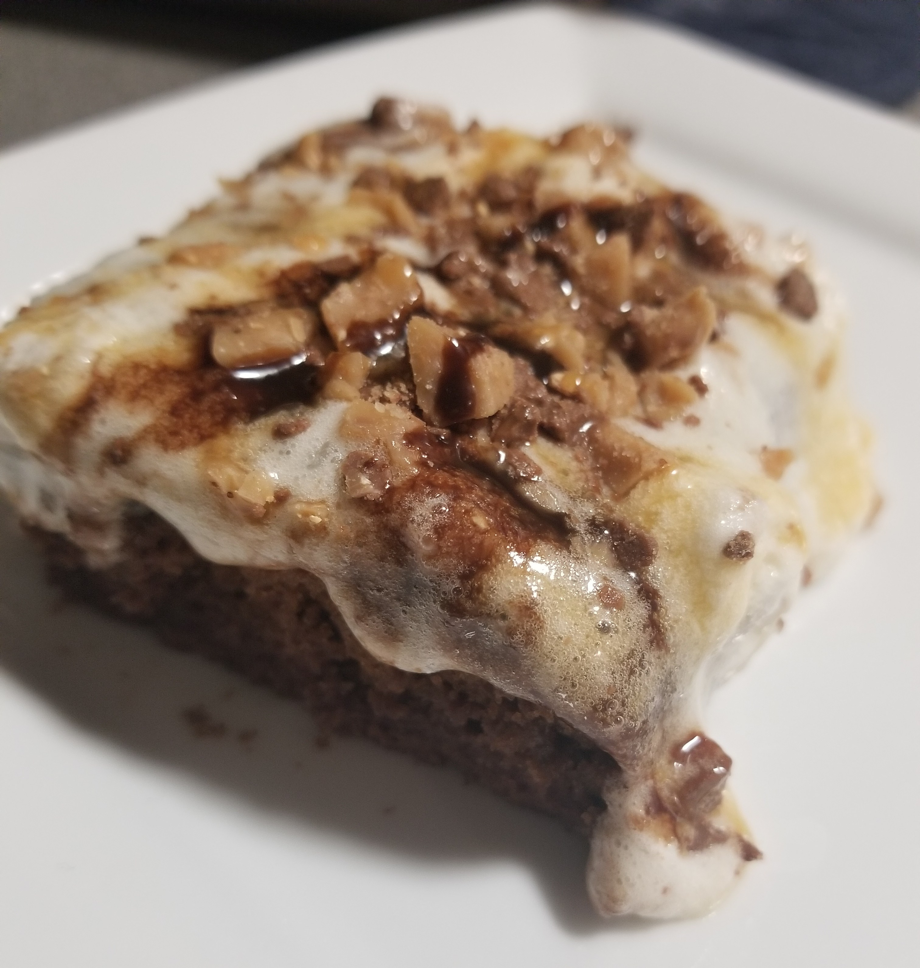 - Once fully covered with the topping, sprinkle 2/3 of the bag of the HEATH toffee bits over the cake. Drizzle with caramel and chocolate syrup as desired. Store the cake in the fridge. Enjoy!