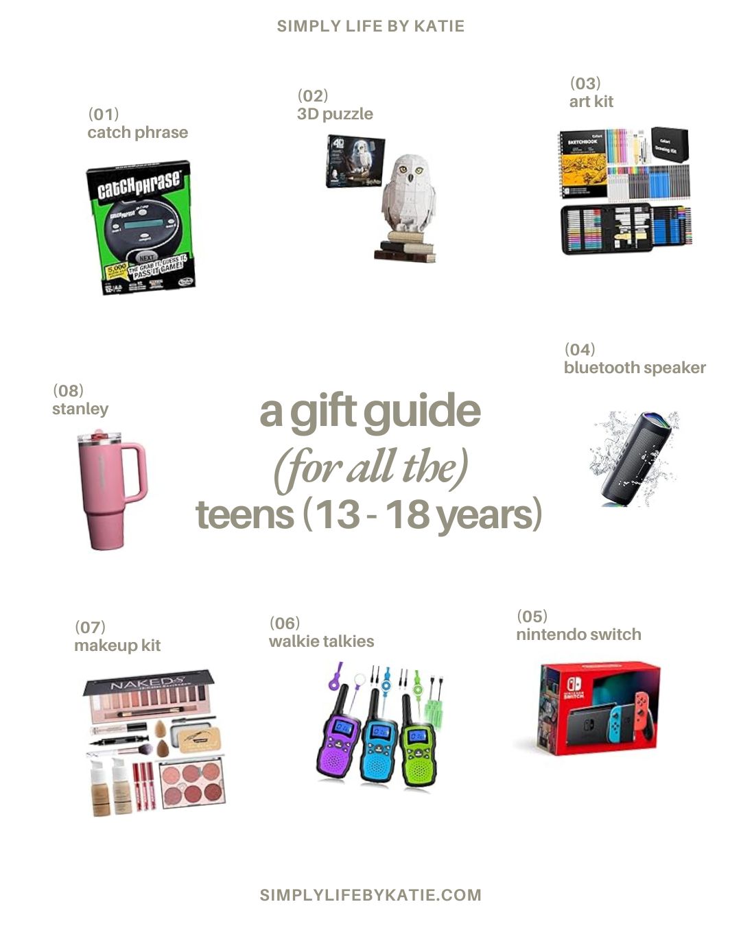 (01) catch phrase, (02) 3D owl puzzle, (03) art kit, (04) bluetooth speaker, (05) nintendo switch, (06) walkie talkies, (07) makeup kit, (08) stanley cup