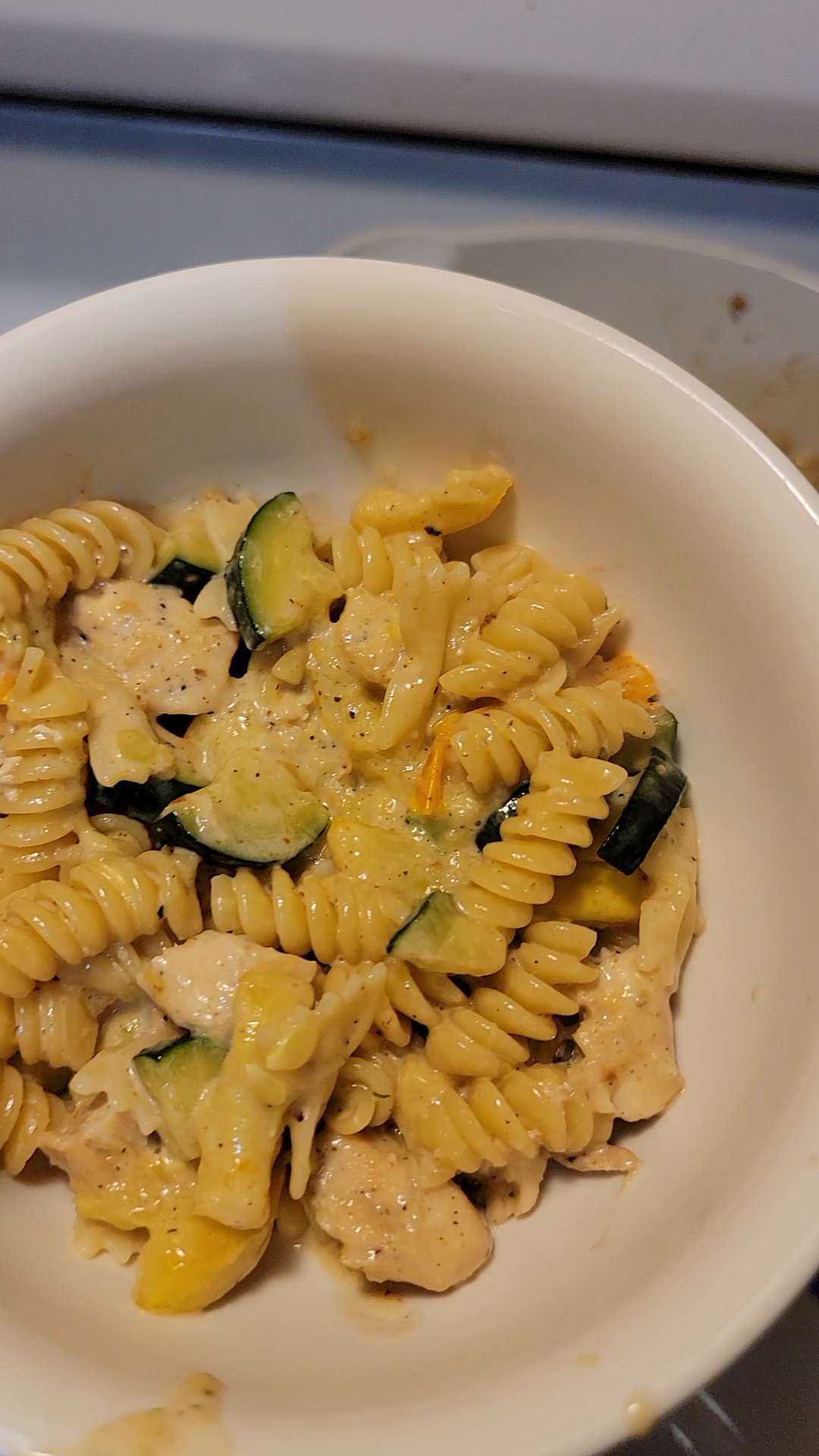 Pasta of your choice (I used Rotini)* Diced chicken* Olive oil or butter* Zucchini* Yellow squash* Bell pepper* Italian seasoning* Salt & pepper* Heavy whipping cream* Parmesan cheese